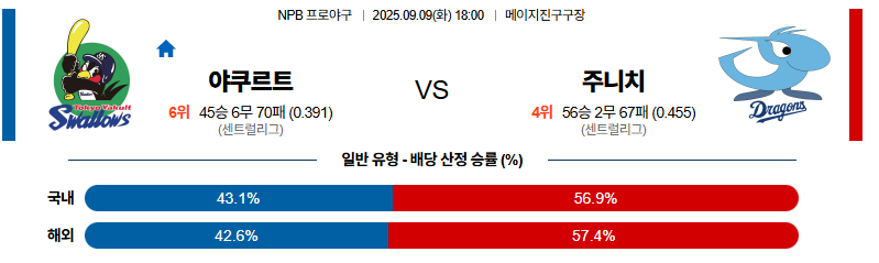 야쿠르트 대 주니치 NPB 09월09일 맞대결 생중계, 스포츠중계, 스포츠분석