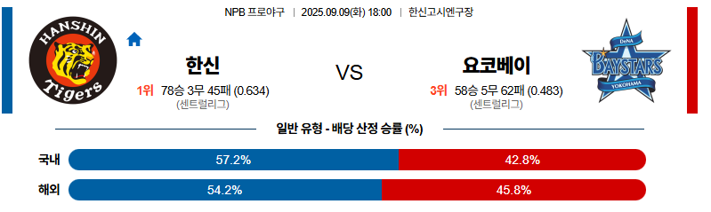 한신 대 요코하마 NPB 09월09일 맞대결 생중계, 스포츠중계, 스포츠분석
