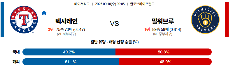 텍사스 대 밀워키 MLB 09월10일 맞대결 생중계, 스포츠중계, 스포츠분석