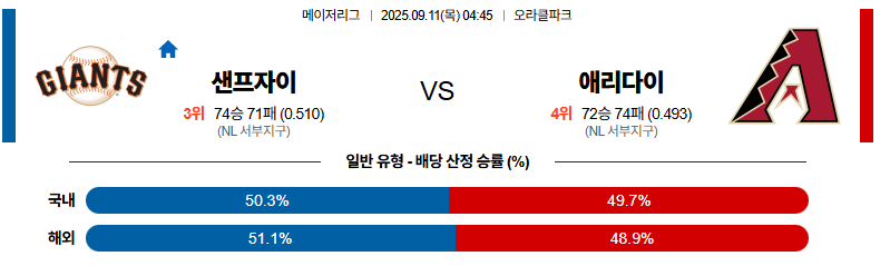 샌프란시스코 대 애리조나 MLB 09월11일 맞대결 생중계, 스포츠중계, 스포츠분석