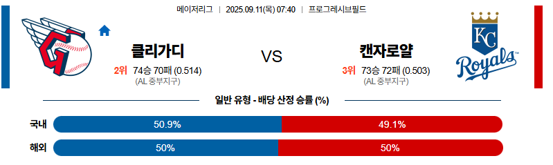 클리블랜드 대 캔자스시티 MLB 09월11일 맞대결 생중계, 스포츠중계, 스포츠분석