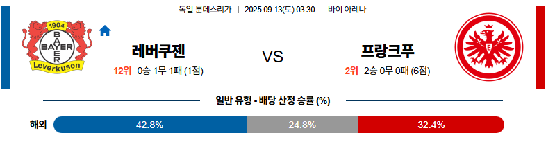 레버쿠젠 대 프랑크푸르트 분데스리가 09월13일 맞대결 생중계, 스포츠중계, 스포츠분석