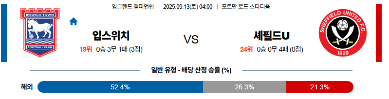 입스위치 대 셰필드유나이티드 잉글랜드챔피언쉽 09월13일 맞대결 생중계, 스포츠중계, 스포츠분석