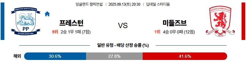 프레스턴 대 미들즈브러 잉글랜드챔피언쉽 09월13일 맞대결 생중계, 스포츠중계, 스포츠분석