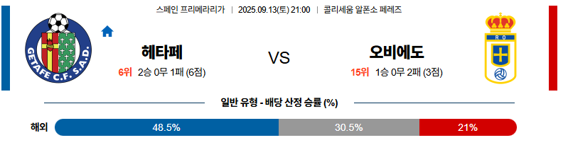 이번 경기는 헤타페가 파이브백을 기반으로 안정적인 수비를 펼치며 역습에서 승부를 볼 가능성이 큽니다. 아람바리의 킬 패스와 전환 능력이 살아나면 우체와 아드리안 리소가 뒷공간을 파고들어 결정적인 장면을 만들 것입니다. 반면 오비에도는 수비 전환이 느리고, 좌우 밸런스가 무너질 경우 쉽게 실점할 위험이 큽니다. 결국 경기의 짜임새와 응집력, 효율적인 역습 구조에서 헤타페가 확실히 우세할 것입니다.