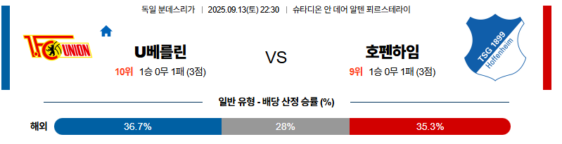 우니온베를린 대 호펜하임 분데스리가 09월13일 맞대결 생중계, 스포츠중계, 스포츠분석