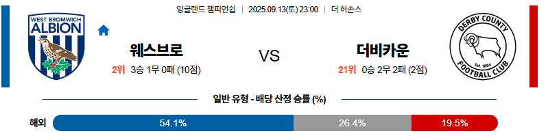 웨스트브로미치 대 더비카운티 잉글랜드챔피언쉽 09월13일 맞대결 생중계, 스포츠중계, 스포츠분석