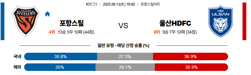 포항 대 울산 K리그1 09월13일 맞대결 생중계, 스포츠중계, 스포츠분석