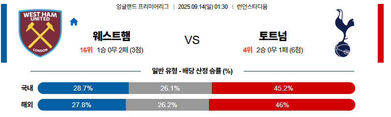 웨스트햄 대 토트넘 프리미어리그 09월14일 맞대결 생중계, 스포츠중계, 스포츠분석