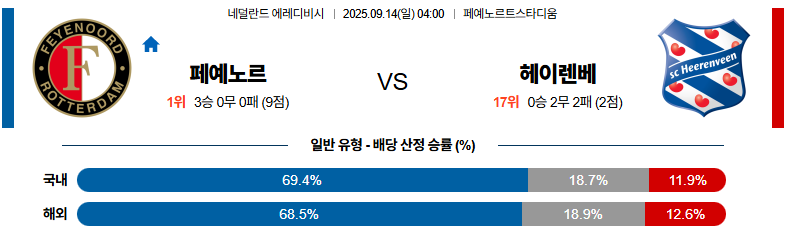 페예노르트 대 헤렌벤 에레디비지 09월14일 맞대결 생중계, 스포츠중계, 스포츠분석