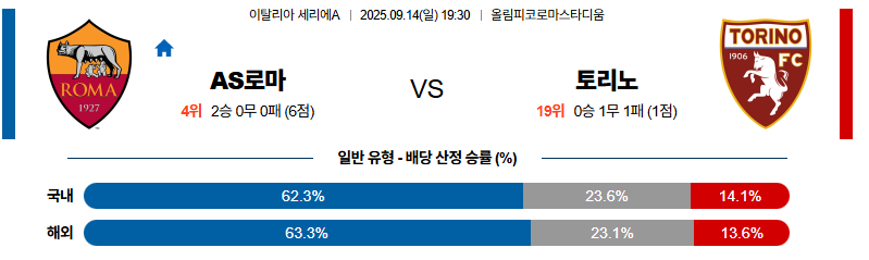 AS로마 대 토리노 세리에A 09월14일 맞대결 생중계, 스포츠중계, 스포츠분석