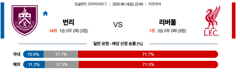리버풀이 경기를 주도할 가능성이 높습니다. 번리는 수비 조직력의 붕괴와 공격 마무리의 부재로 어려움을 겪을 것으로 보입니다.
