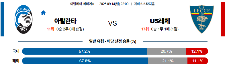 아탈란타 대 레체 세리에A 09월14일 맞대결 생중계, 스포츠중계, 스포츠분석