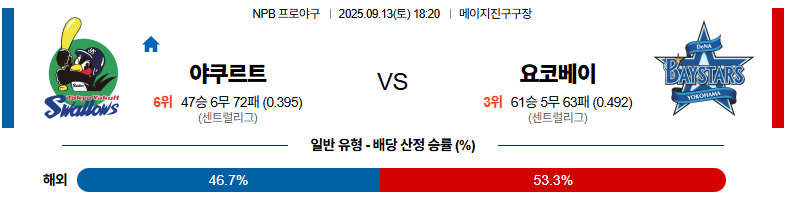 야쿠르트 대 요코하마 NPB 09월13일 맞대결 생중계, 스포츠중계, 스포츠분석