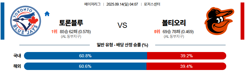 토론토 대 볼티모어 MLB 09월14일 맞대결 생중계, 스포츠중계, 스포츠분석
