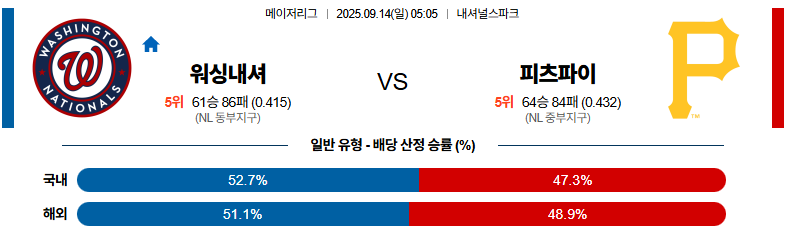 워싱턴 대 피츠버그 MLB 09월14일 맞대결 생중계, 스포츠중계, 스포츠분석