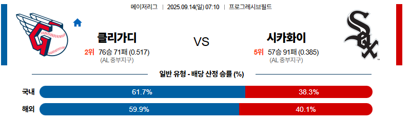 클리블랜드 대 시카고W MLB 09월14일 맞대결 생중계, 스포츠중계, 스포츠분석