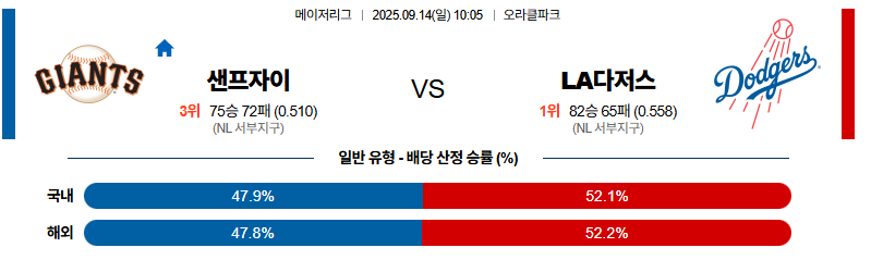 샌프란시스코 대 LA다저스 MLB 09월14일 맞대결 생중계, 스포츠중계, 스포츠분석