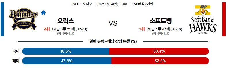 오릭스 대 소프트뱅크 NPB 09월14일 맞대결 생중계, 스포츠중계, 스포츠분석