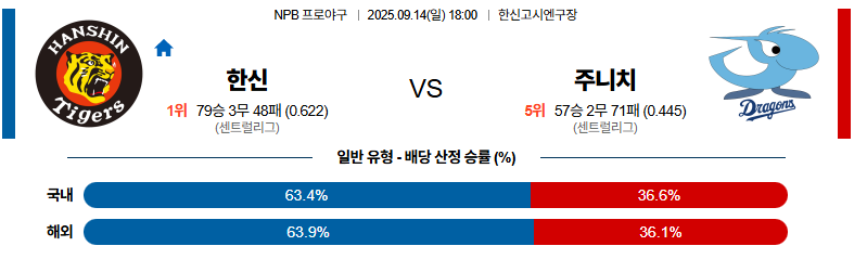 한신 대 주니치 NPB 09월14일 맞대결 생중계, 스포츠중계, 스포츠분석