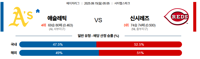애슬레틱스 대 신시내티 MLB 09월15일 맞대결 생중계, 스포츠중계, 스포츠분석