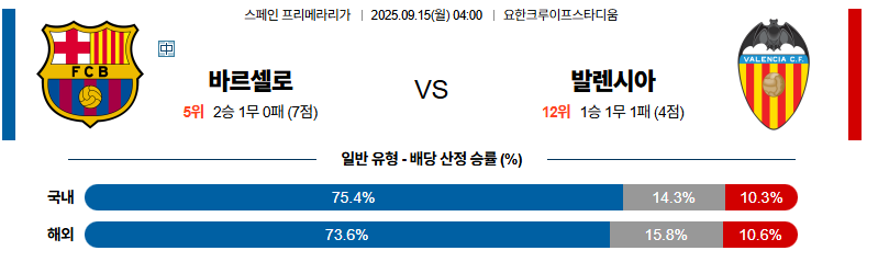 바르셀로나는 라민 야말을 중심으로 발 빠른 공격 전개와 뒷공간 공략을 통해 득점 찬스를 양산할 준비가 되어 있습니다. 발렌시아는 블록 수비를 유지하더라도 순간적인 속도 싸움에서 밀리며, 경기 내내 위기를 맞을 수 있습니다. 결국 이 매치는 바르셀로나의 공격 완성도와 빠른 템포가 빛을 발하며 홈 승리로 이어질 가능성이 큽니다.