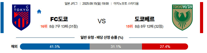 FC도쿄 대 도쿄베르디 J리그1 09월15일 맞대결 생중계, 스포츠중계, 스포츠분석