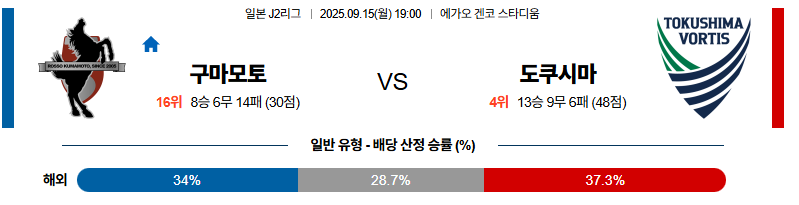 구마모토 대 도쿠시마 J리그2 09월15일 맞대결 생중계, 스포츠중계, 스포츠분석