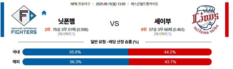 니혼햄 대 세이부 NPB 09월15일 맞대결 생중계, 스포츠중계, 스포츠분석