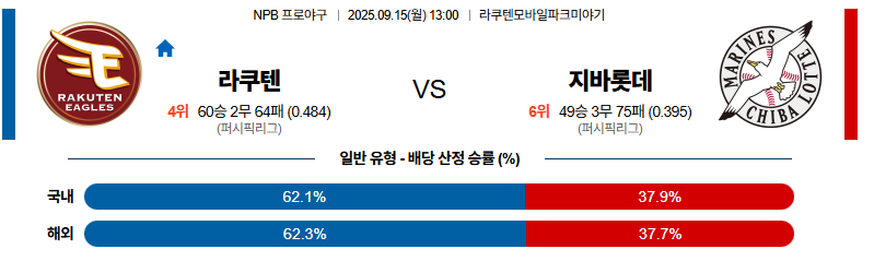 라쿠텐 대 지바롯데 NPB 09월15일 맞대결 생중계, 스포츠중계, 스포츠분석