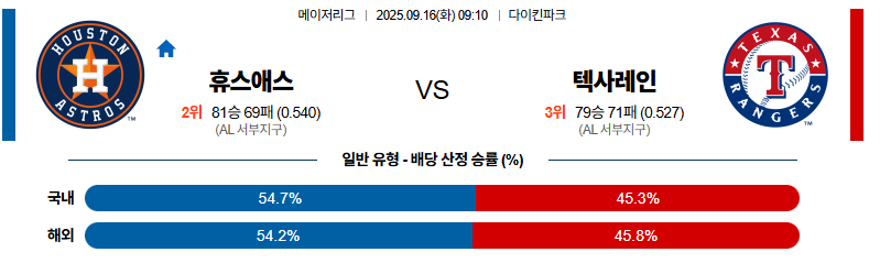 휴스턴 대 텍사스 MLB 09월16일 맞대결 생중계, 스포츠중계, 스포츠분석