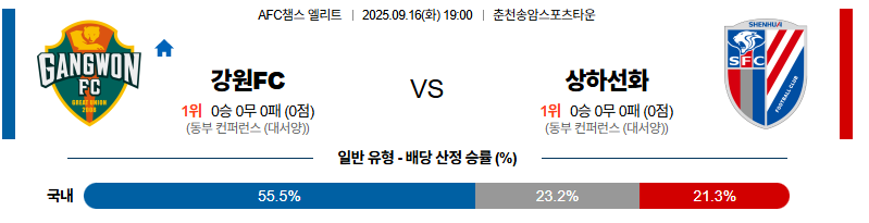 강원 대 상하이선화 AFC챔피언스리그 09월16일 맞대결 생중계, 스포츠중계, 스포츠분석