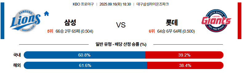 삼성 대 롯데 KBO 09월16일 맞대결 생중계, 스포츠중계, 스포츠분석