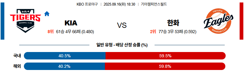 KIA 대 한화 KBO 09월16일 맞대결 생중계, 스포츠중계, 스포츠분석