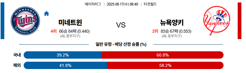 미네소타 대 뉴욕양키스 MLB 09월17일 맞대결 생중계, 스포츠중계, 스포츠분석