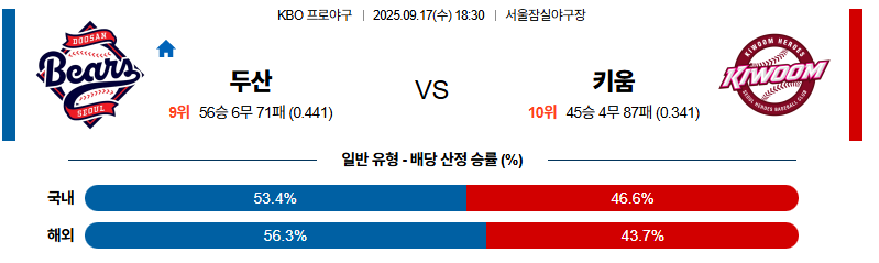 두산 대 키움 KBO 09월17일 맞대결 생중계, 스포츠중계, 스포츠분석