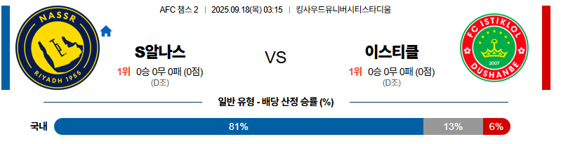 알나스르 대 이스티크롤 AFC챔피언스리그2 09월18일 맞대결 생중계, 스포츠중계, 스포츠분석