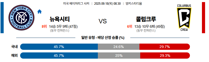 뉴욕시티 대 콜럼버스 메이저리그사커 09월18일 맞대결 생중계, 스포츠중계, 스포츠분석
