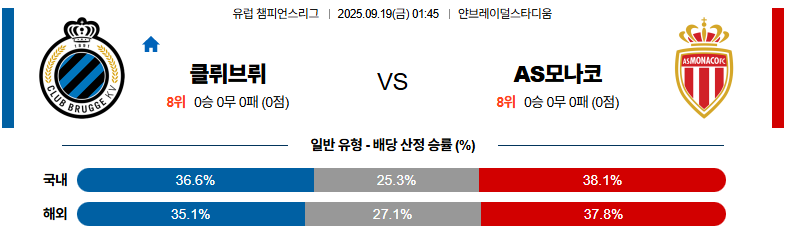 클럽브뤼헤 대 AS모나코 UEFA챔피언스리그 09월19일 맞대결 생중계, 스포츠중계, 스포츠분석