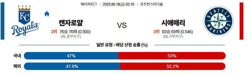 캔자스시티 대 시애틀 MLB 09월19일 맞대결 생중계, 스포츠중계, 스포츠분석