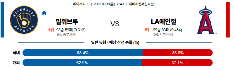 밀워키 대 LA에인절스 MLB 09월19일 맞대결 생중계, 스포츠중계, 스포츠분석