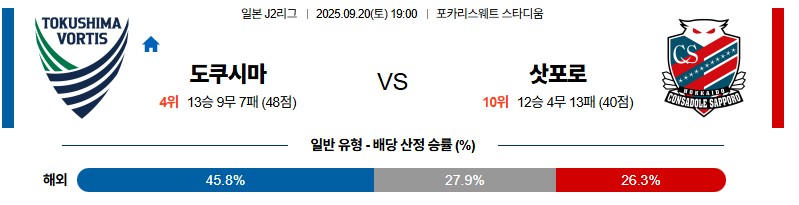 도쿠시마 대 삿포로 J리그2 09월20일 맞대결 생중계, 스포츠중계, 스포츠분석