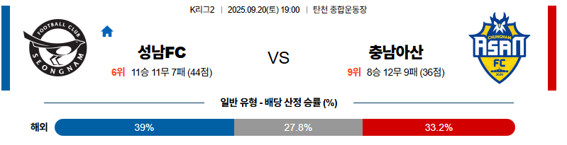 성남 대 충남아산 K리그2 09월20일 맞대결 생중계, 스포츠중계, 스포츠분석
