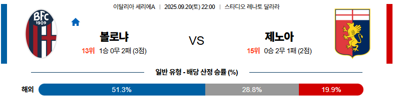 볼로냐 대 제노아 세리에A 09월20일 맞대결 생중계, 스포츠중계, 스포츠분석