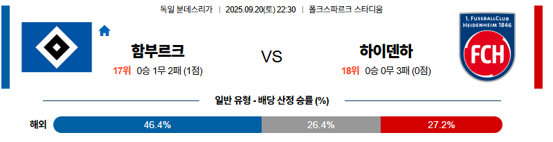 함부르크 대 하이덴하임 분데스리가 09월20일 맞대결 생중계, 스포츠중계, 스포츠분석