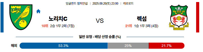 노리치시티 대 렉섬 잉글랜드챔피언쉽 09월20일 맞대결 생중계, 스포츠중계, 스포츠분석