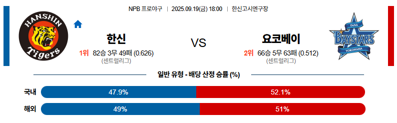 한신 대 요코하마 NPB 09월19일 맞대결 생중계, 스포츠중계, 스포츠분석