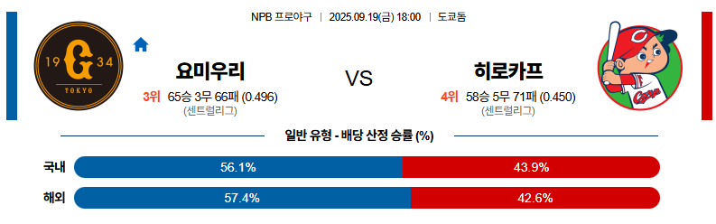 요미우리 대 히로시마 NPB 09월19일 맞대결 생중계, 스포츠중계, 스포츠분석
