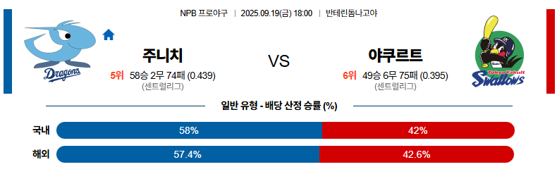 주니치 대 야쿠르트 NPB 09월19일 맞대결 생중계, 스포츠중계, 스포츠분석