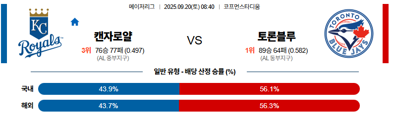 캔자스시티 대 토론토 MLB 09월20일 맞대결 생중계, 스포츠중계, 스포츠분석
